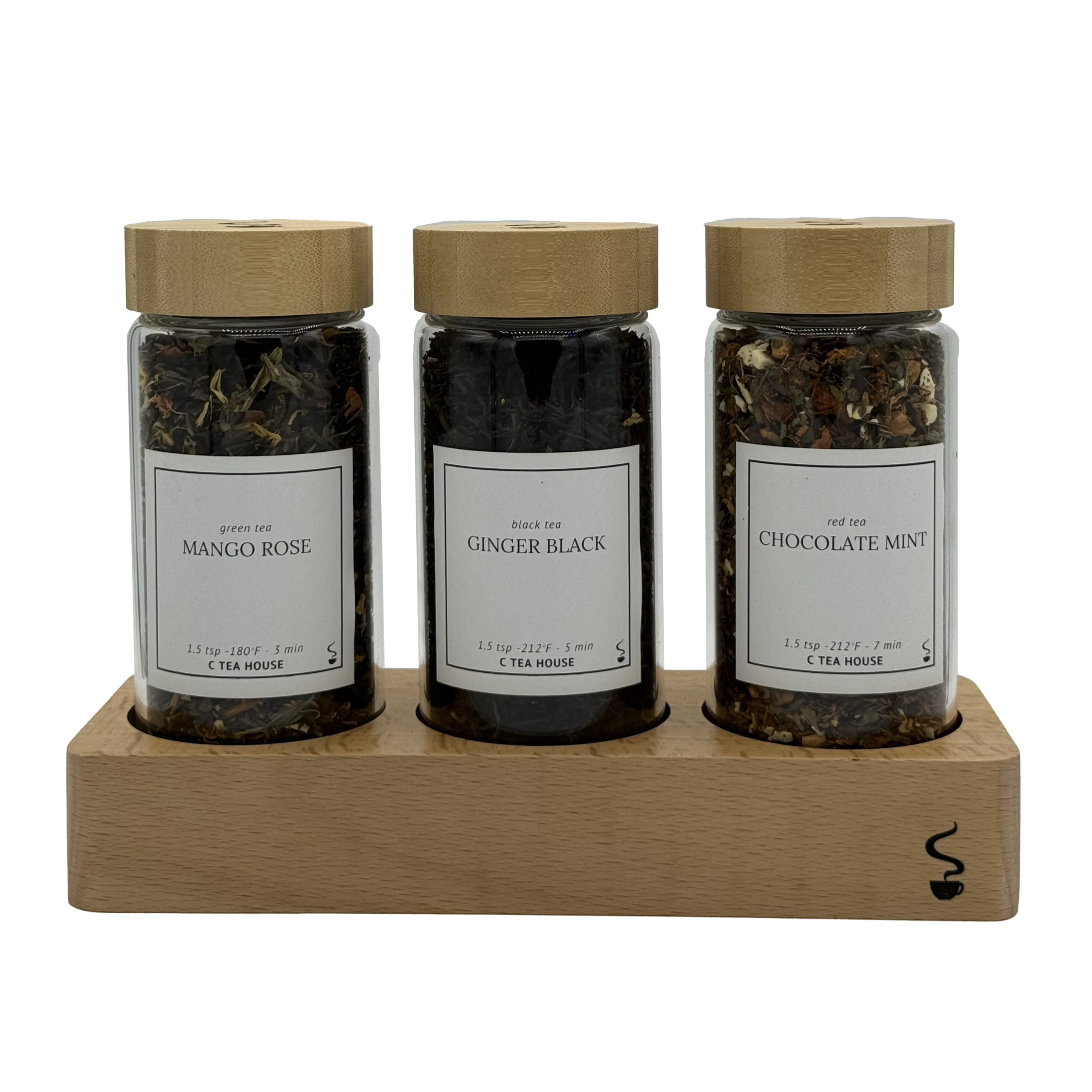 Our loose leaf tea gift set is the perfect blend of elegance and functionality for tea lovers. This set includes three premium glass tubes filled with loose leaf tea, each sealed with a wooden screw-top lid to lock in freshness. The tubes rest in a beautifully crafted wooden display base, making it an eye-catching addition to any kitchen or tea station.
